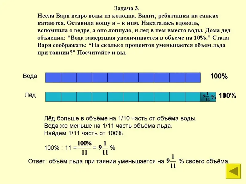 - Несла Варя ведро воды из колодца. Видит, ребятишки на санках катаются. Оставила ношу и - к ним. Накаталась вдоволь, вспомнила ведре, а оно лопнуло, и лед в нем вместо воды. Дома дед объяснил: "Вода замерзшая увеличивается в объеме на 10%." Стала Варя соображать: "На сколько процентов уменьшается объем льда при таянии?" Посчитайте и вы.