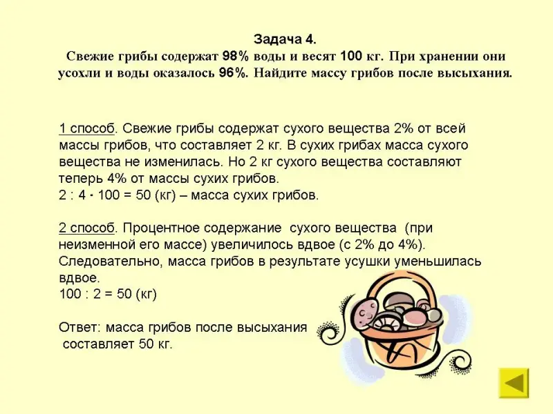 - Свежие грибы содержат 98% воды и весят 100 кг. При хранении они усохли и воды оказалось 96%. Найдите массу грибов после высыхания.