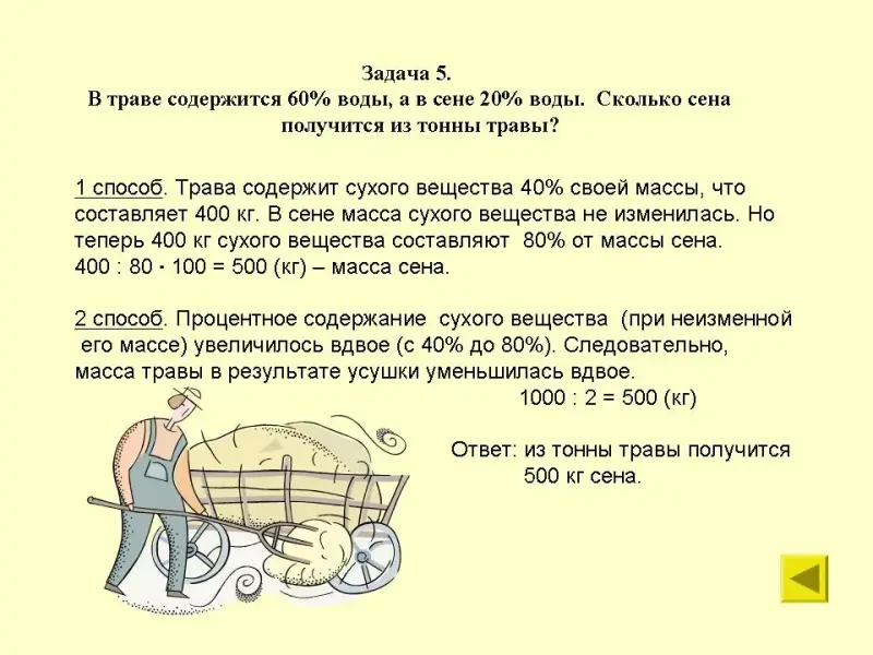 Задача 10. Влажность свежей травы 75%, влажность сухой - 40%. Необходимо получить 10 кг сухой травы. Сколько свежей травы нужно для этого собрать?