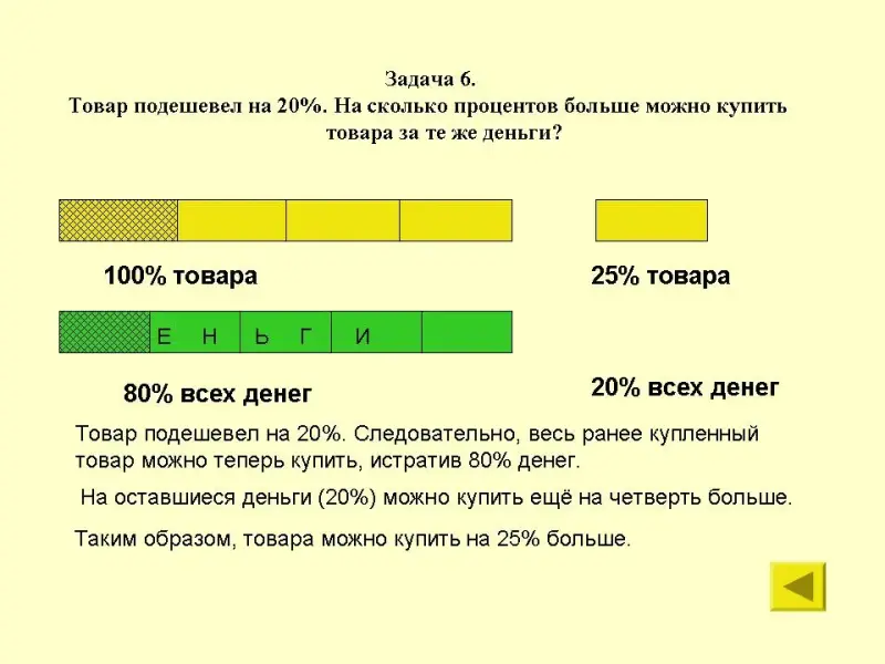 - Товар подешевел на 20%. На сколько процентов больше можно купить товара за те же деньги?