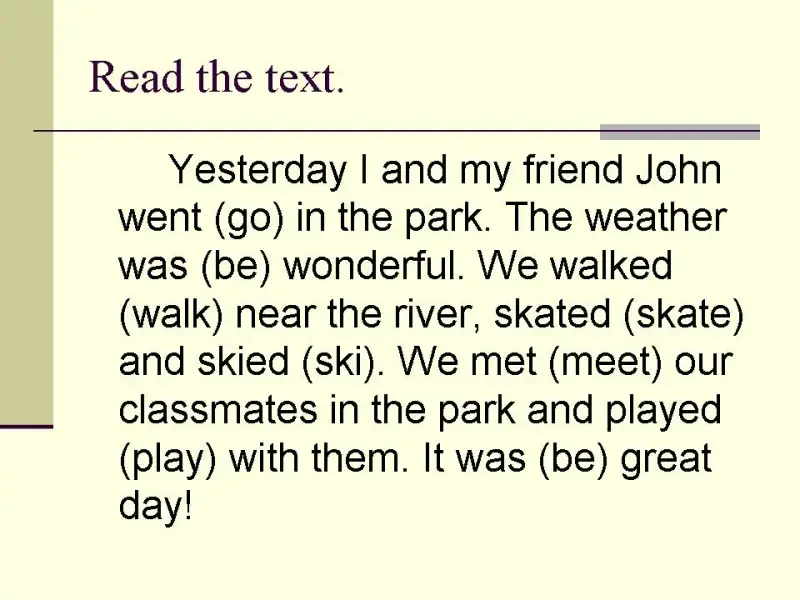 Yesterday I and my friend John went (go) in the park. The weather was (be) wonderful. We walked (walk) near the river, skated (skate) and skied (ski). We met (meet) our classmates in the park and played (play) with them. It was (be) great day!