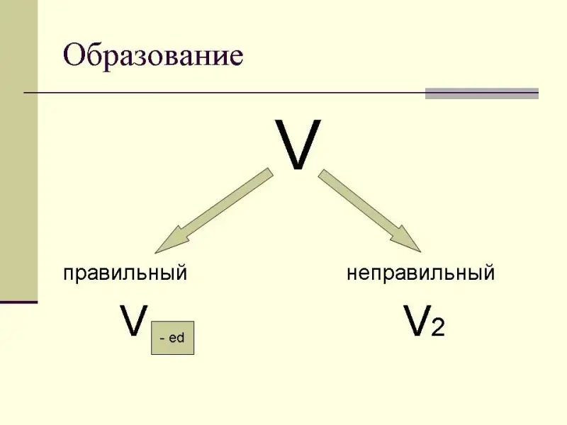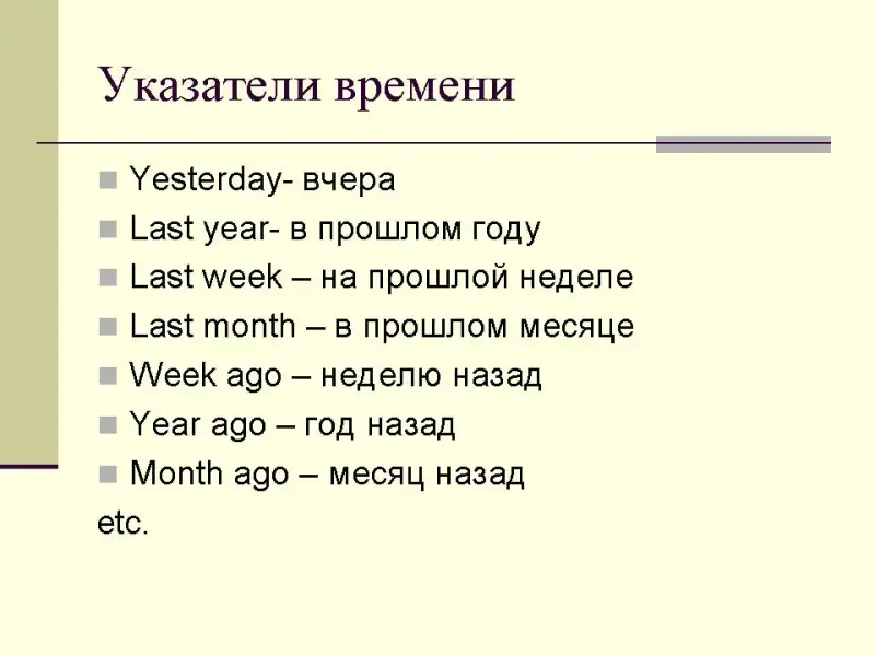 Учащиеся должны перевести первое слово - вчера - и сделать вывод, что это прошедшее время. В русском языке оно обозначает, что действие, о котором идет речь, произошло в прошлом. Они видят, что в тексте встречаются два вида глаголов: одни присоединяют к себе окончание - ed, другие изменяются полностью. Эти глаголы можно найти в таблице неправильных глаголов, которая на этом и нескольких следующих уроках должна висеть перед глазами учащихся. На простое прошедшее время могут указывать особенные слова, такие как Yesterday.