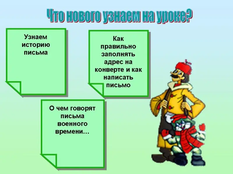 На уроке мы узнаем историю письма, как правильно заполнять адрес на конверте и как написать письмо, о чем говорят письма военного времени… (СЛАЙДЫ 1-3)