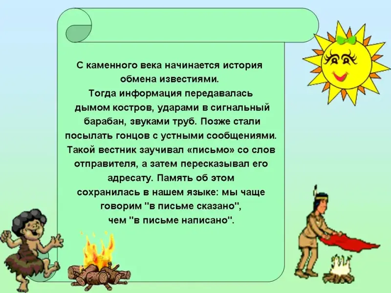 б) С каменного века начинается история обмена известиями. Тогда информация передавалась дымом костров, ударами в сигнальный барабан, звуками труб. Позже стали посылать гонцов с устными сообщениями. Такой вестник заучивал «письмо» со слов отправителя, а затем пересказывал его адресату. Память об этом сохранилась в нашем языке: мы чаще говорим "в письме сказано", чем "в письме написано". (СЛАЙД 6)