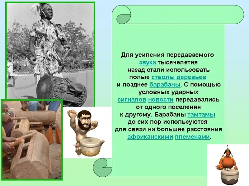в) Для усиления передаваемого звука тысячелетия назад стали использовать полые стволы деревьев и позднее барабаны. С помощью условных ударных сигналов новости передавались от одного поселения к другому. Барабаны тамтамы до сих пор используются