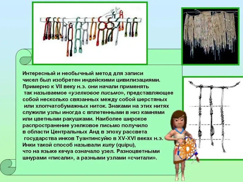 г) Интересный и необычный метод для записи чисел был изобретен индейскими цивилизациями. Примерно к VII веку н.э. они начали применять так называемое «узелковое письмо», представляющее собой несколько связанных между собой шерстяных