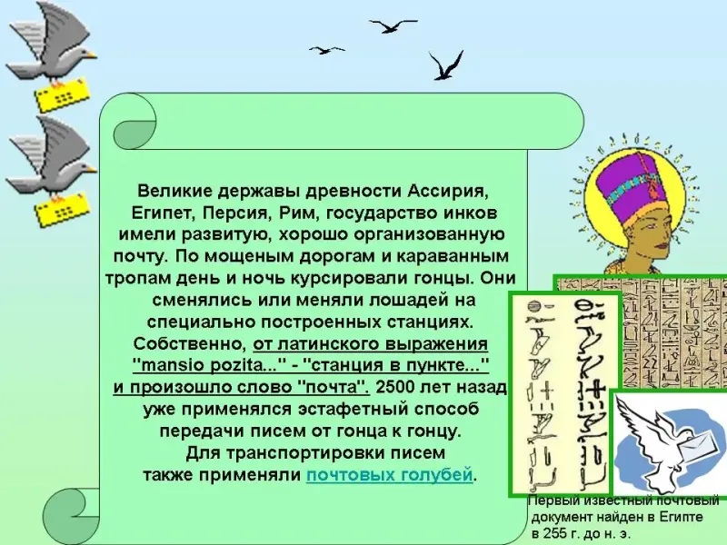 д) Великие державы древности Ассирия, Египет, Персия, Рим, государство инков имели развитую, хорошо организованную почту. По мощеным дорогам и караванным тропам день и ночь курсировали гонцы. Они сменялись или меняли лошадей на специально построенных станциях. Собственно, от латинского выражения "mansio pozita..." - "станция в пункте..." и произошло слово "почта". 2500 лет назад уже применялся эстафетный способ передачи писем от гонца к гонцу. Для транспортировки писем также применяли почтовых голубей. (СЛАЙД 9)