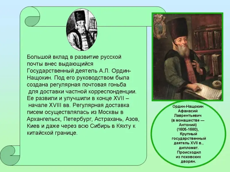 е) Большой вклад в развитие русской почты внес выдающийся Государственный деятель А.Л. Ордин-Нащокин. Под его руководством была создана регулярная почтовая гоньба для доставки частной корреспонденции. Ее развили и улучшили в конце XVII - начале XVIII вв. Регулярная доставка писем осуществлялась из Москвы в Архангельск, Петербург, Астрахань, Азов, Киев и даже через всю Сибирь в Кяхту к китайской границе. (СЛАЙД 10)
