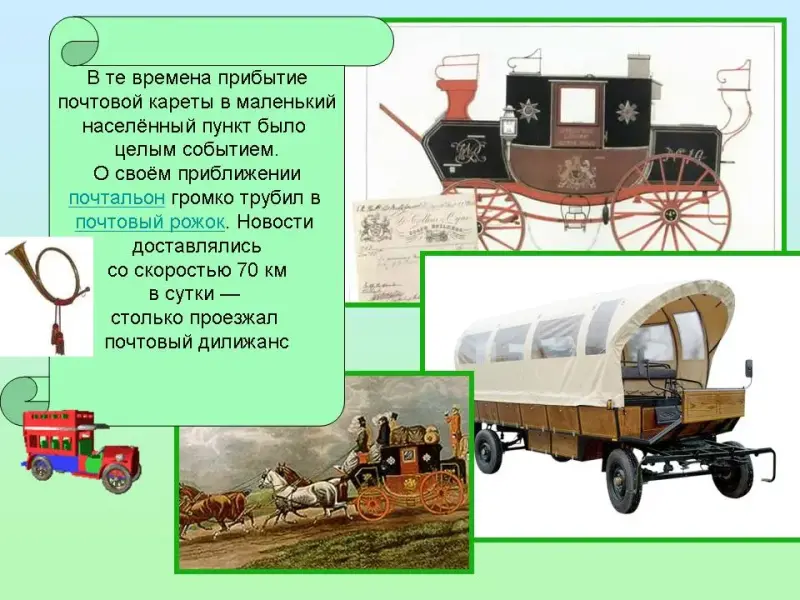 ж) В те времена прибытие почтовой кареты в маленький населённый пункт было целым событием. О своём приближении почтальон громко трубил в почтовый рожок. Новости доставлялись со скоростью 70 км в сутки - столько проезжал почтовый дилижанс. (СЛАЙД 11)