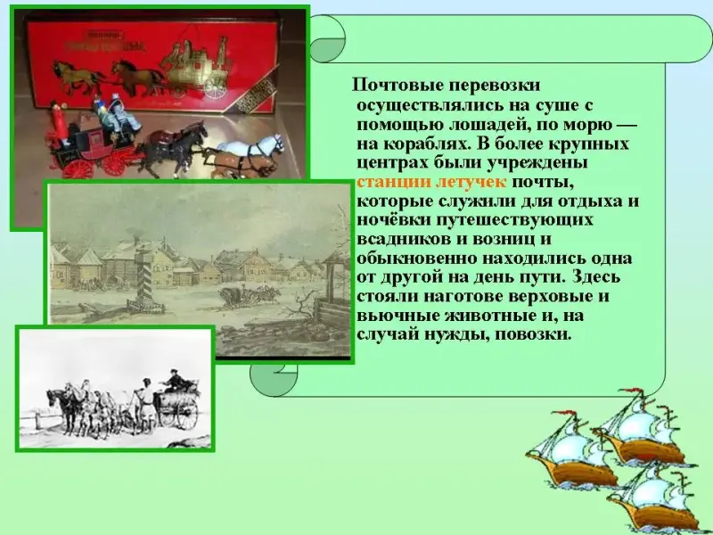 з) Почтовые перевозки осуществлялись на суше с помощью лошадей, по морю - на кораблях. В более крупных центрах были учреждены станции летучек почты, которые служили для отдыха и ночёвки путешествующих всадников и возниц и обыкновенно находились одна от другой на день пути. Здесь стояли наготове верховые и вьючные животные и, на случай нужды, повозки. (СЛАЙД 12)