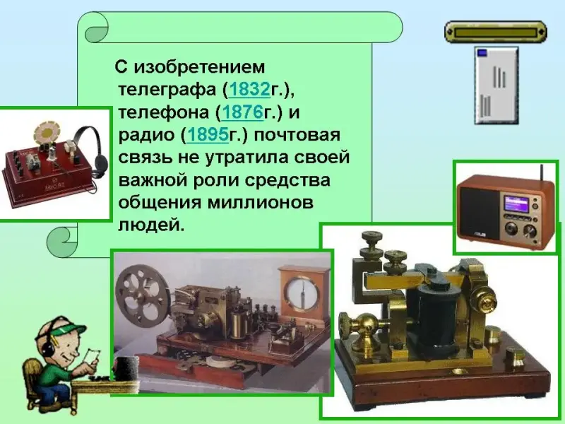 и) С изобретением телеграфа (1832 г.), телефона (1876 г.) и радио (1895 г.) почтовая связь не утратила своей важной роли средства общения миллионов людей. (СЛАЙД 13)