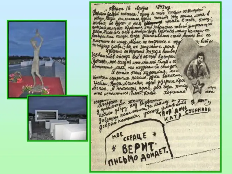 - После освобождения белорусского города Лиозно в 1944 году при разборе кирпичной кладки разрушенной печи в одном из домов был найден маленький желтый конверт, прошитый нитками. В нем оказалось письмо белорусской девочки Кати Сусаниной, отданной в рабство гитлеровскому помещику. Доведенная до отчаяния, в день своего 15-летия она решила покончить жизнь самоубийством. Перед смертью написала последнее письмо отцу. На конверте стоял адрес: «Действующая армия. Полевая почта №... Сусанину Петру». На другой стороне карандашом написаны слова: «Дорогие дяденька или тетенька, кто найдет это спрятанное от немцев письмо, умоляю вас, опустите сразу в почтовый ящик. Мой труп уже будет висеть на веревке». Номер полевой почты, написанный на конверте, устарел, и письмо не могло попасть адресату, но оно дошло до сердца советских людей. Опубликовано в «Комсомольской правде» 27 мая 1944 года (СЛАЙД 19)