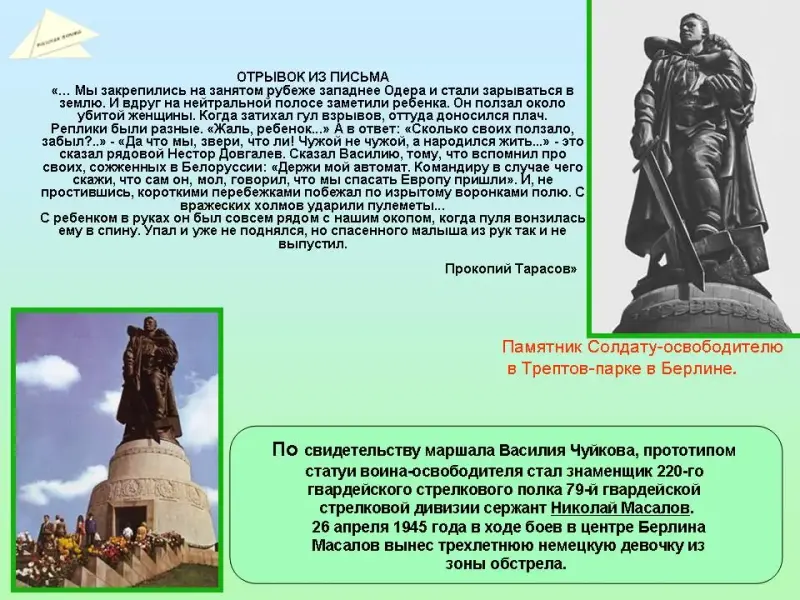 Б) В Трептов-парке в Берлине открыт памятник Солдату-освободителю. Послушайте письмо-воспоминание Прокопия Тарасова (СЛАЙД 20)