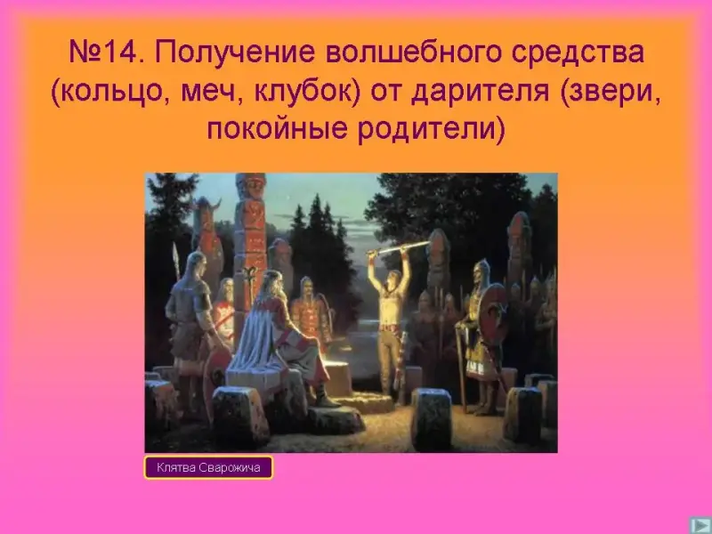 - Развитие действия: герой отправляется в путь, пересекает границу иного мира (даритель, волшебное средство).