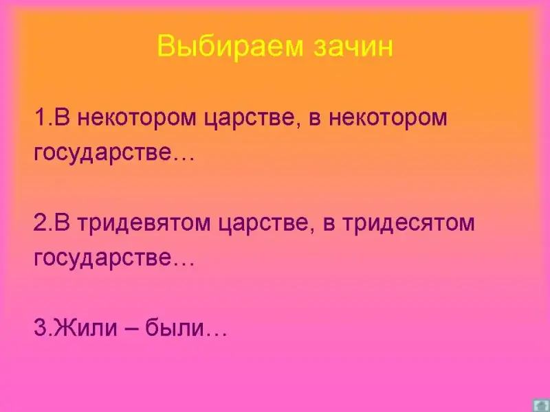 - знать сказочные присказки, зачины, концовки, словесные формулы, особенности языка волшебной сказки;