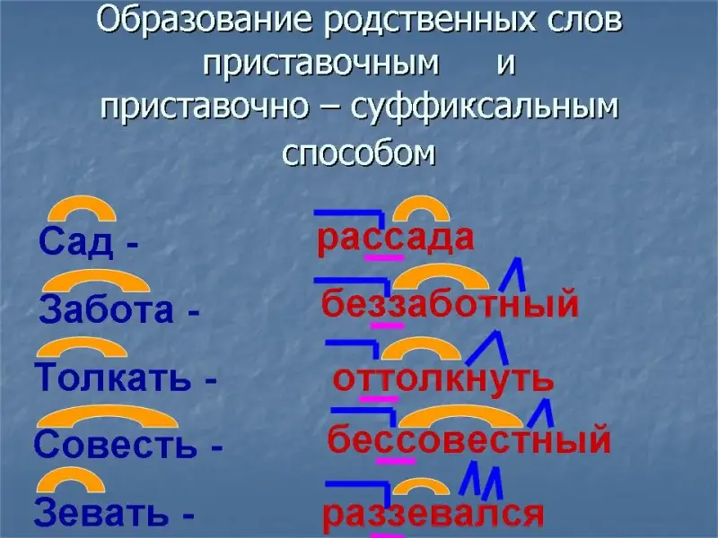 Образование родственных слов приставочным и приставочно-суффиксальным способом.