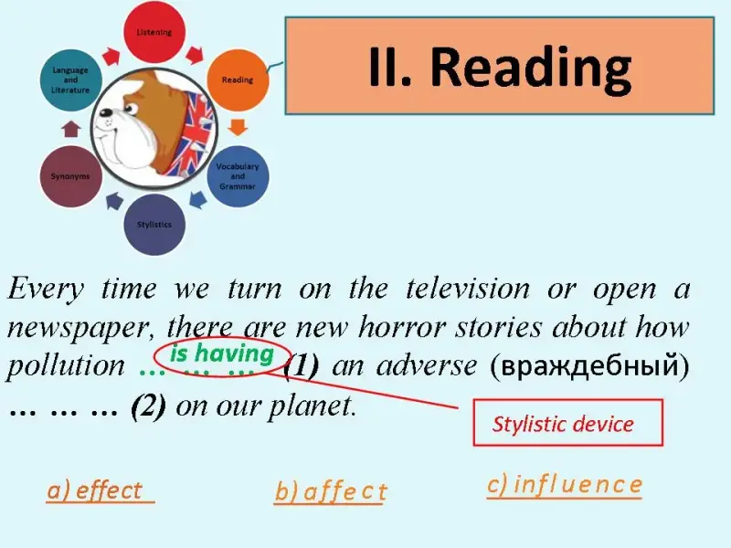 Для заполнения второго пропуска предлагаются варианты: a) effectb) affectc) influence. Affect, если тест не связан с психологией, где состояние аффекта означает состояние сильного возбуждения, - это глагол. Здесь мы видим, что перед словосочетанием «adverse …» стоит артикль an, значит, пропущенное слово - существительное, и выбирать следует между словами effectи influence. Effect - это существительное, которое переводится как «результат, впечатление»,influence - «влияние». В сущности, эти слова являются синонимами. Если обратиться к словарю, например, www.oup.com/elt/oald, то можно найти информацию, что именно effect сочетается с прилагательным adverse: anadverseeffect, а существительное influenceупотребляется с прилагательным bad: badinfluence.