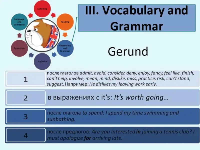 Герундий - это неличная форма глагола, имеющая признаки глагола и существительного. Герундий образуется путем прибавления к глаголу окончания -ing. Имеет смысл обратить внимание на следующие трудные случаи употребления герундия: