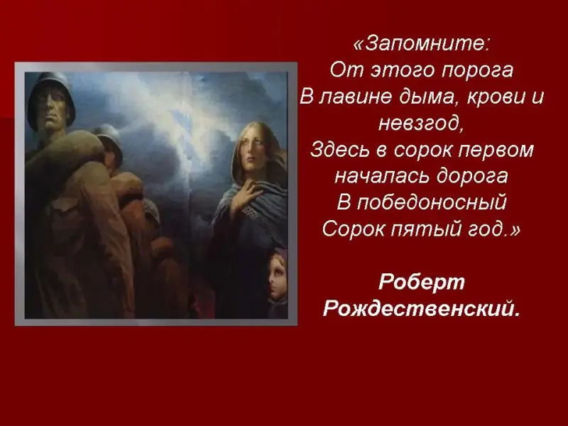 - Кто написал слова: «Вспомним всех поименно, / Горем вспомним своим. / Это нужно не мертвым,/ Это нужно живым». (Р. Рождественский.)