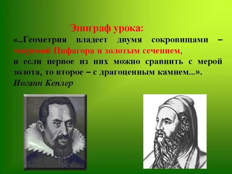 Эпиграф урока: «…Геометрия владеет двумя сокровищами - теоремой Пифагора и золотым сечением, и если первое из них можно сравнить с мерой золота, то второе - с драгоценным камнем…». Иоганн Кеплер