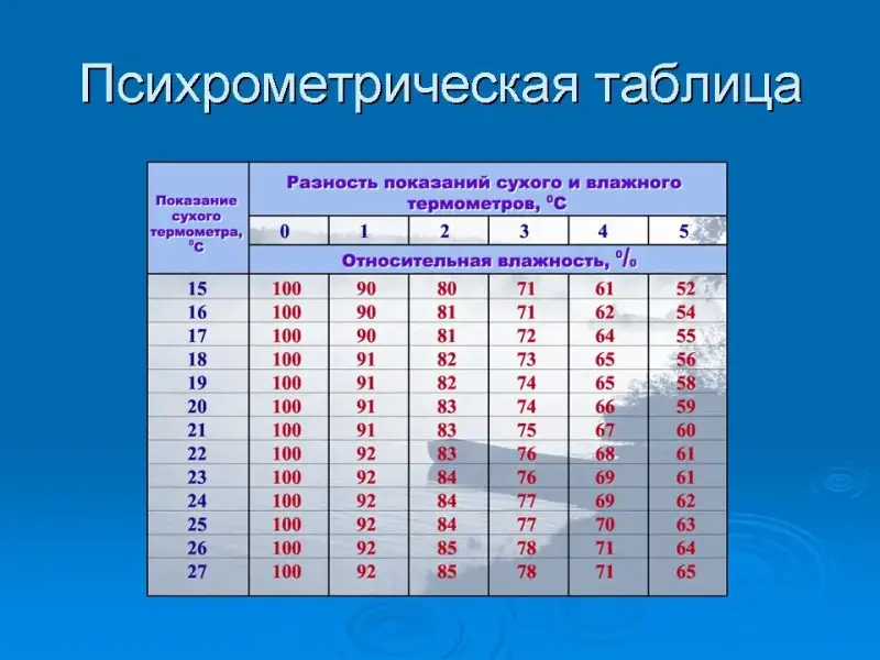 - Уметь пользоваться гигрометром и психрометром, психрометрическими таблицами и таблицами плотности насыщенных водяных паров.