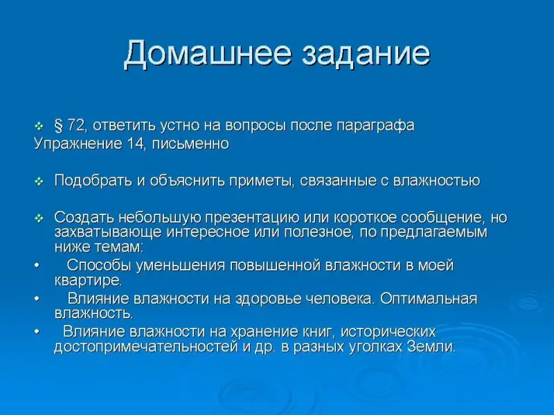 Упражнение 14, письменно. Подобрать и объяснить приметы, связанные с влажностью. Создать небольшую презентацию или короткое сообщение, но захватывающе интересное или полезное, по предлагаемым ниже