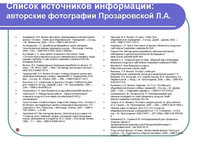 - Соломыкина Е. В., Печорская М. И. Интегрированный урок (физика+география) по теме "Влажность воздуха" //сайт urok.1sept.ru/articles 551138.