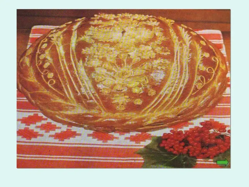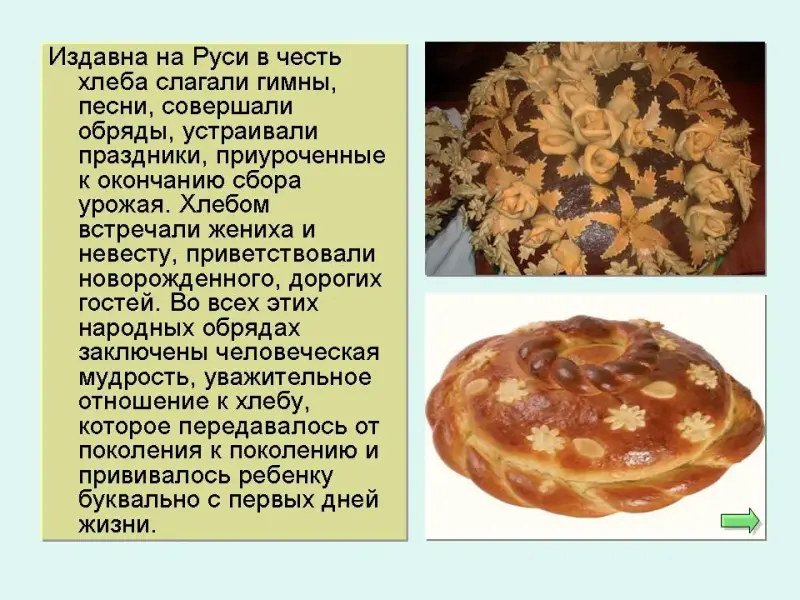 Учитель: Издавна на Руси в честь хлеба слагали гимны, песни, совершали обряды, устраивали праздники, приуроченные к окончанию сбора урожая. Хлебом встречали жениха и невесту, приветствовали новорожденного, дорогих гостей. Во всех этих народных обрядах заключены человеческая мудрость, уважительное отношение к хлебу, которое передавалось от поколения к поколению и прививалось ребенку буквально с первых дней жизни.