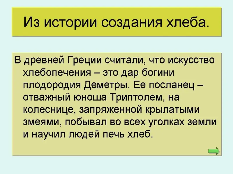 1-й ученик: В древней Греции считали, что искусство хлебопечения - это дар богини плодородия Деметры. Ее посланец - отважный юноша Триптолем, на колеснице, запряженной крылатыми змеями, побывал во всех уголках земли и научил людей печь хлеб.