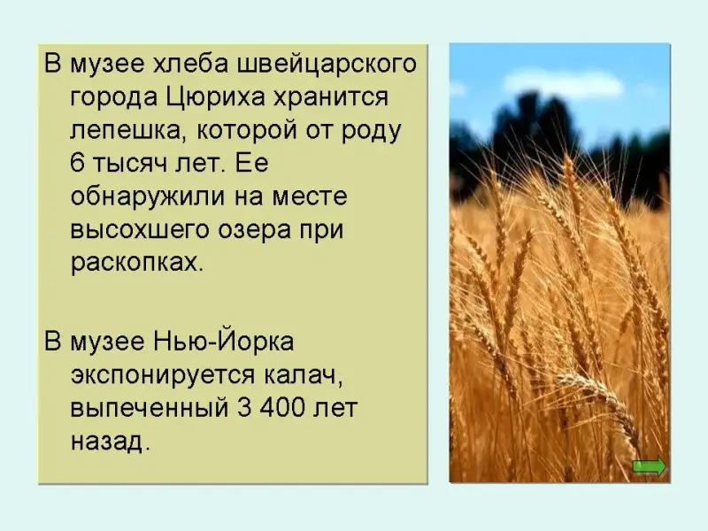 2-й ученик: В музее хлеба швейцарского города Цюриха хранится лепешка, которой от роду 6 тысяч лет. Ее обнаружили на месте высохшего озера при раскопках. В музее Нью-Йорка экспонируется калач, выпеченный 3 400 лет назад.