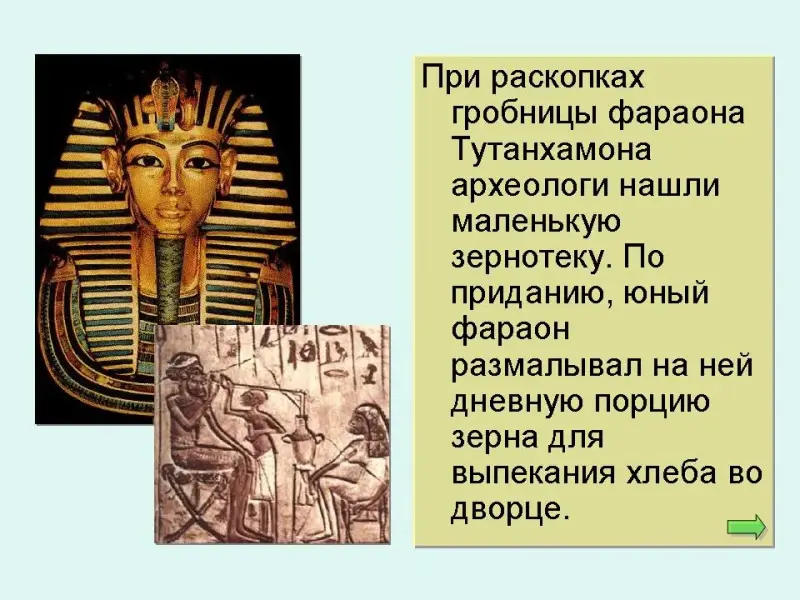3-й ученик: При раскопках гробницы фараона Тутанхамона археологи нашли маленькую зернотеку. По приданию, юный фараон размалывал на ней дневную порцию зерна для выпекания хлеба во дворце.