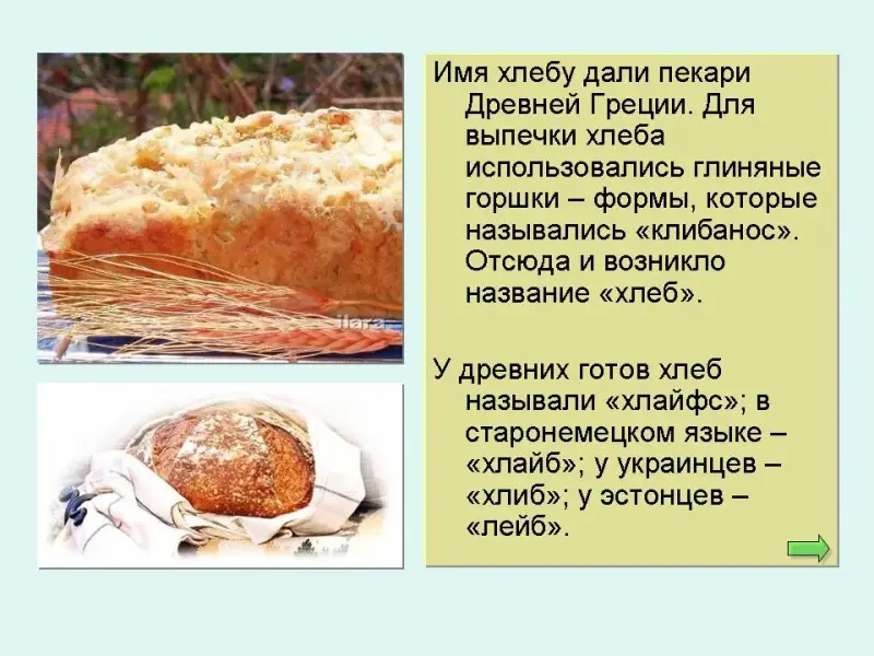 4-й ученик: Имя хлебу дали пекари Древней Греции. Для выпечки хлеба использовались глиняные горшки - формы, которые назывались "клибанос". Отсюда и возникло название "хлеб".
