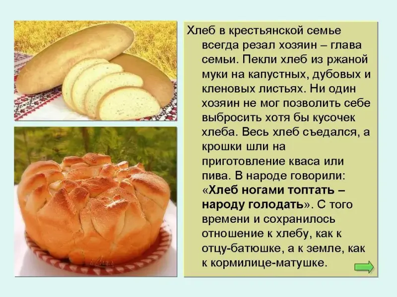 Учитель: Хлеб в крестьянской семье всегда резал хозяин - глава семьи. Пекли хлеб из ржаной муки на капустных, дубовых и кленовых листьях. Ни один хозяин не мог позволить себе выбросить хотя бы кусочек хлеба. Весь хлеб съедался, а крошки шли на приготовление кваса или пива. В народе говорили: "Хлеб ногами топтать - народу голодать". С того времени и сохранилось отношение к хлебу, как к отцу-батюшке, а к земле, как к кормилице-матушке.