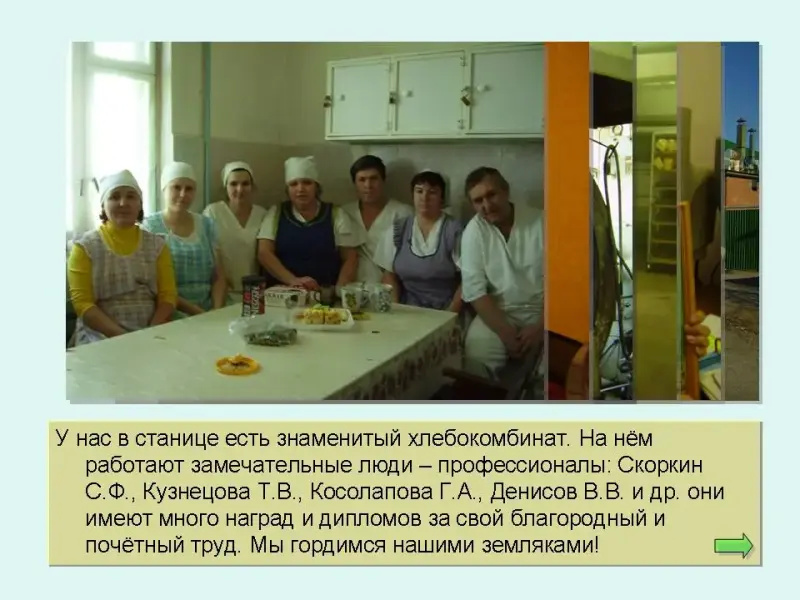 Ученик: У нас в станице есть знаменитый хлебокомбинат. На нем работают замечательные люди - профессионалы: Скоркин С.Ф., Кузнецова Т.В., Косолапова Г.А., Денисов В.В. Они дарят нам вкусный, пахучий хлеб. Эти люди имеют много наград и дипломов за свой благородный и почетный труд. Мы гордимся нашими земляками!