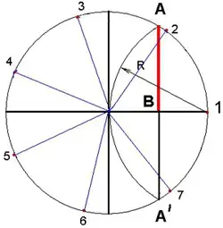- Расстояние АВ откладываем от точки 1 по окружности семь раз и получают искомые точки 1-7.