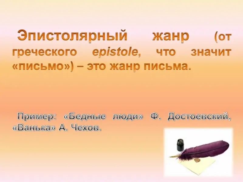 - Что такое эпистолярный жанр? (Эпистолярный жанр в широком понимании - это жанр письма. Само название этого жанра происходит от греческого слова epistole, что значит "письмо".)