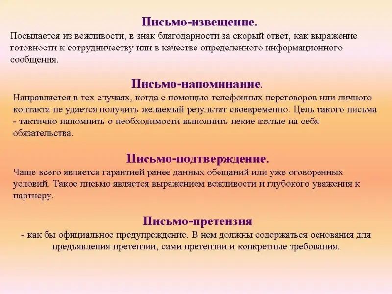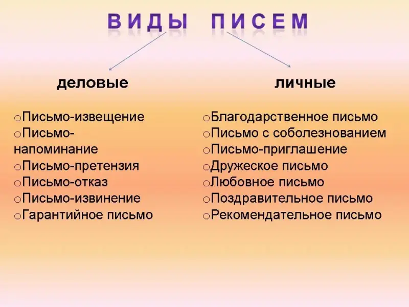 - Подумайте, какие бывают письма? (Письма можно разделить на два вида: деловые и личные, которые делятся на подвиды.)