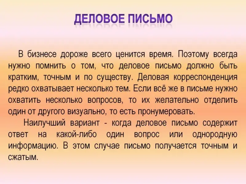 Самое главное - деловое письмо должно быть содержательным и его содержание должно быть интересным не только для отправителя, но и для получателя. Никакие формулы вежливости и шаблоны не спасут письмо, если в нем нет делового содержания.