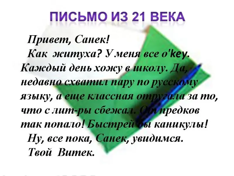 Как житуха? У меня все о'key. Каждый день хожу в школу. Да, недавно схватил пару по русскому языку, а еще классная отругала за то, что с лит-ры сбежал. От предков так попало! Быстрей бы каникулы!