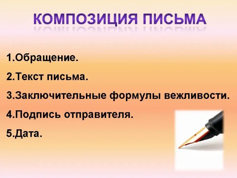 - Теперь, когда вы знаете, какие бывают письма, каким стилем их надо писать, вы дома попробуете написать письмо. Для этого вспомним композицию письма. (Слайд 16).
