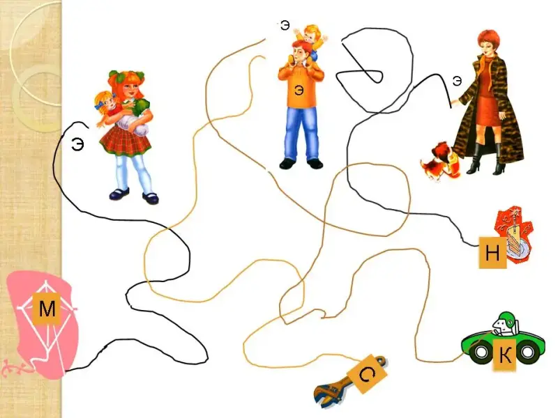 - Каждый член семьи поёт свою песенку, помогите по очереди спеть маме, папе и детям, но будьте внимательны, не запутайтесь - найдите и пропойте свой звук, в зависимости от того, кому принадлежат эти предметы. (Например, выходит 1-й ученик, он поет с мамой Эммой - Э - М)
