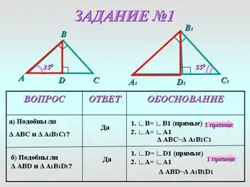 - Сколько пар равных углов нам нужно найти? Найдите эти пары. (Две пары: 1. ∟В= ∟В1 (прямые),2. ∟A= ∟A1)