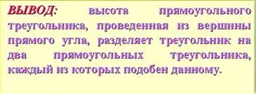 - А теперь давайте сделаем полный вывод.(ВЫВОД: высота прямоугольного треугольника, проведенная из вершины прямого угла, разделяет треугольник на два подобных прямоугольных треугольника, каждый из которых подобен данному)