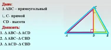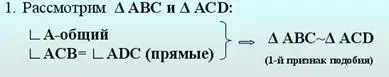 - Итак, сформулируйте еще раз теорему (Высота прямоугольного треугольника, проведенная из вершины прямого угла, разделяет треугольник на два подобных прямоугольных треугольника, каждый из которых подобен данному)