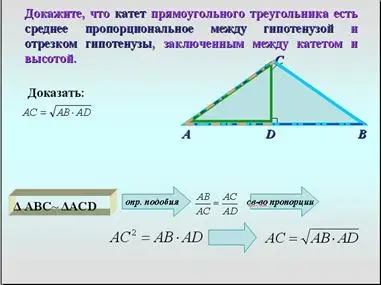 - А теперь докажите самостоятельно, что катет прямоугольного треугольника есть среднее пропорциональное между гипотенузой и отрезком гипотенузы, заключенным между катетом и высотой.