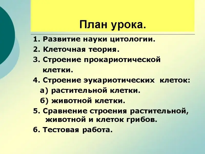 План урока 1. Развитие науки цитологии. 2. Клеточная теория. 3. Строение прокариотической клетки. 4. Строение эукариотических клеток: а) растительной клетки. б) животной клетки. 5. Сравнение строения растительной, животной и клеток грибов. 6. Тестовая работа. |