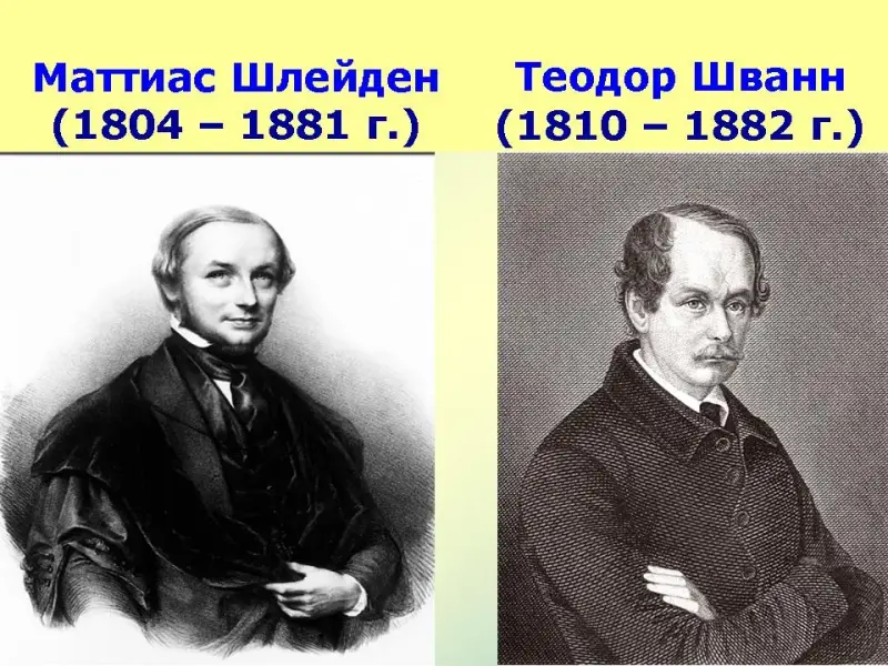 Вот они выдающиеся деятели цитологии XIX века Шлейден и Шванн. На дворе уже 1839 год, знаменитый год в моей жизни, вот труд, созданный за многие лета моей жизни (читает) "Микроскопические исследования соответствии структуре и росту животных и растений". Многим помогал мне, известный всем ботаник Шлейден, благодарен весьма я ему! Сотрудничая с ним, вот что у нас получилось. |