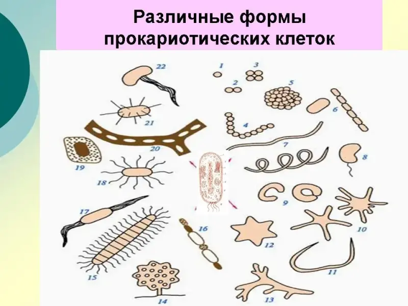 | 14 | Различные формы прокариотических клеток. | Кокки, вибрионы и спириллы, палочковидные. |