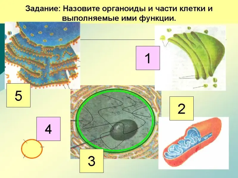 2 - Митохондрии (запас энергии) 3 - Ядро (деление) 4 - рибосома (синтез белка) 5 - Эндоплазматическая сеть |