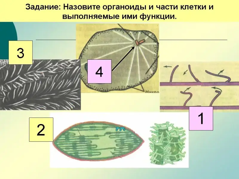 2 - хлоропласт (фотосинтез) 3 - реснички (движение) 4- центриоли (Клеточный центр) (деление клетки) |
